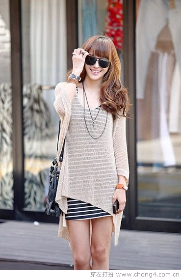03 泛有金属光泽感的肉色针织罩衫,透明材质性感万分,蝙蝠衫款休闲飘逸,凸显玲珑有致的美妙身段,不规则剪裁个性新潮,里面混搭条纹吊带短裙相当有型。
