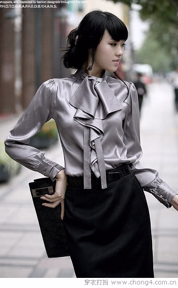 03 高贵奢华的亮丽水晶扣,肩部小褶皱,胸前荷叶边飘饰,挺立的背部剪裁,衬显优雅仪态!银灰色缎面,完美的华丽端庄。搭配西裤或西裙,线条流畅,利索干练。