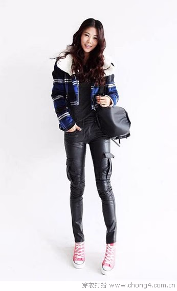 04 摇滚气质的帅气皮裤出乎意料的搭配粉色帆布鞋,正符合如今酷辣+甜美的Mix风尚。