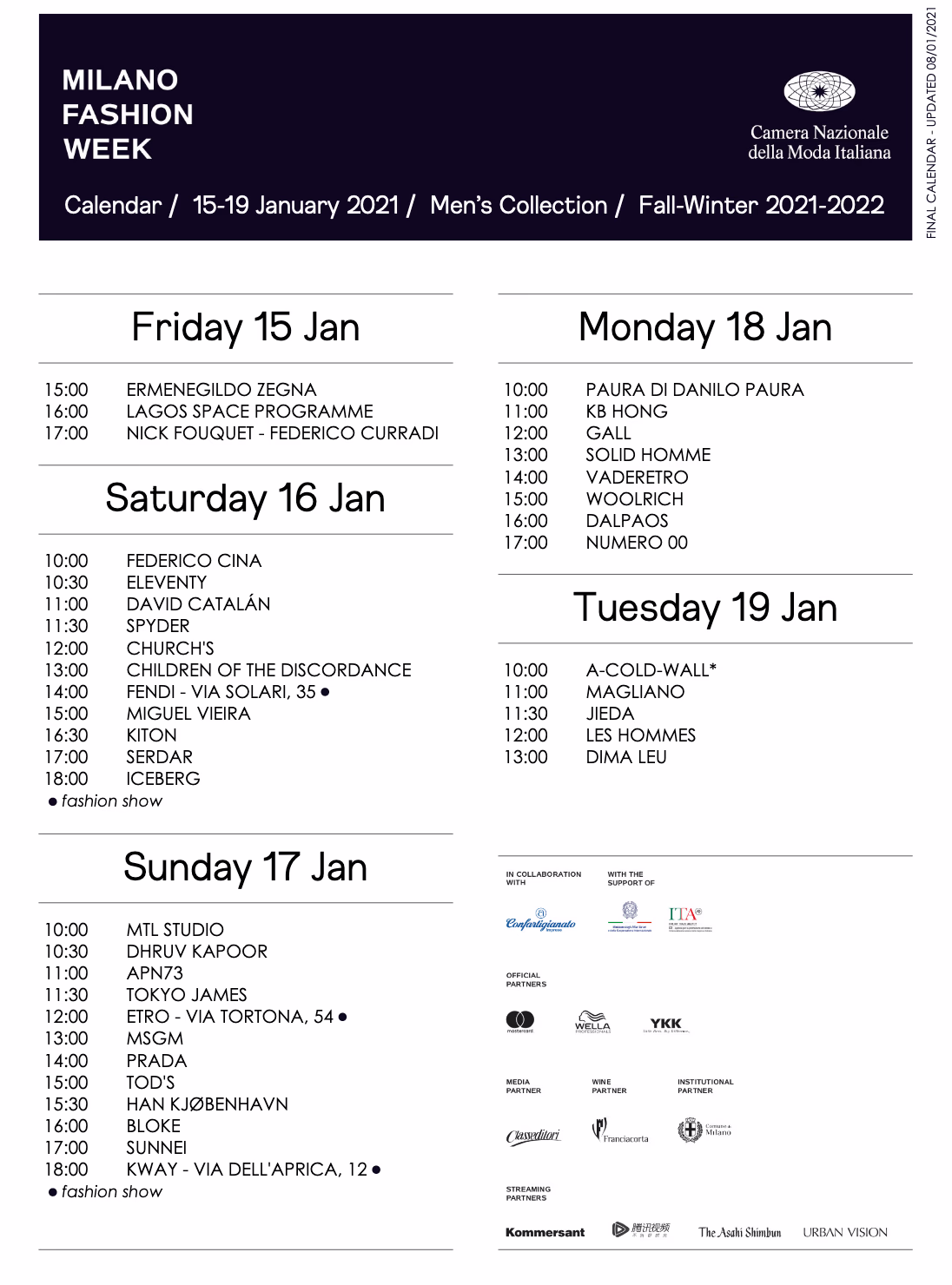 意大利国家时装商会(Camera Nazionale della Moda Italiana,以下简称 CNMI)主席 Carlo Capasa 此前曾表示,无论如何,米兰时装周将确保下一届男装周在1月举行,女装周在2月举行。他说:“我们将继续与巴黎时装周保持一致,并将重新采用实体形式。我们将根据目前的情况,评估(米兰)即将举行的数字秀的进展。是否举办 T 台秀将由各品牌自己决定。”