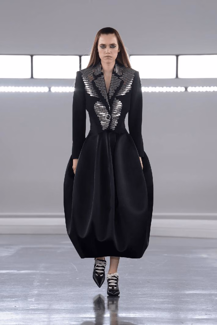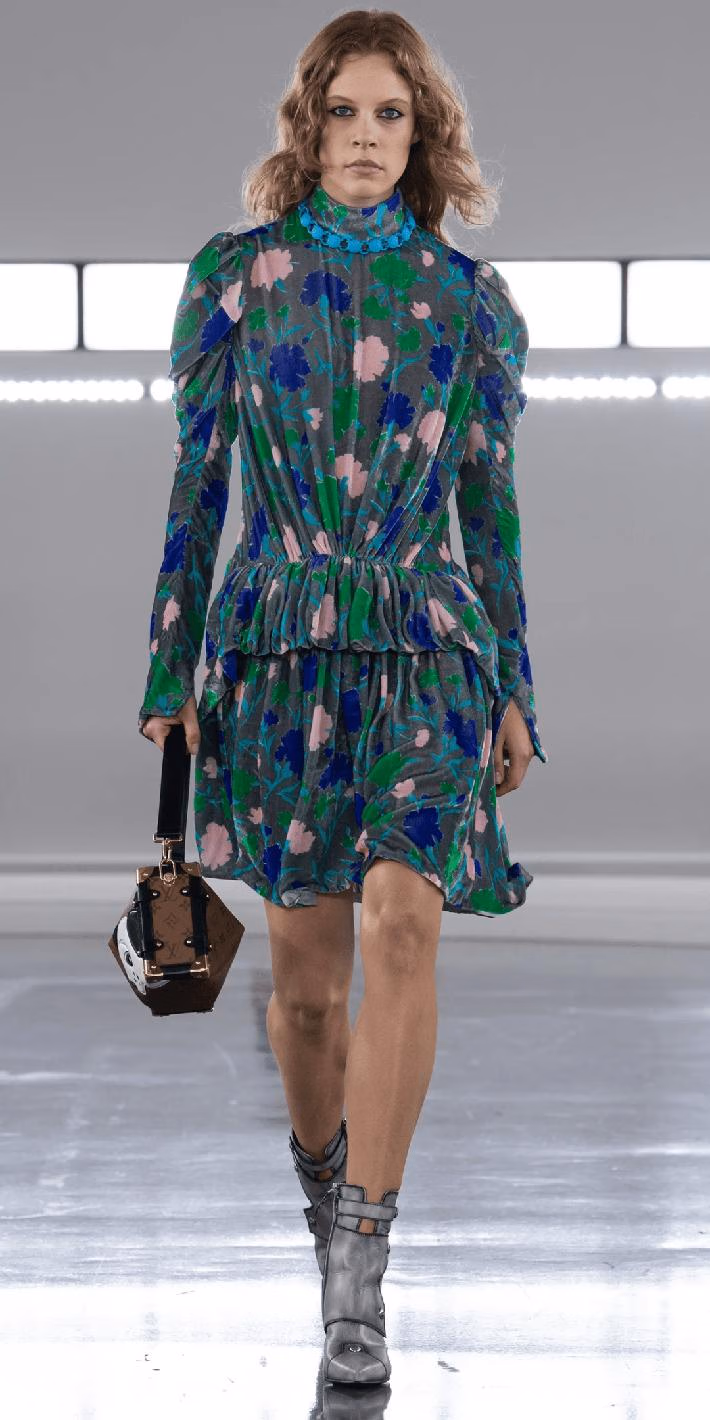 还有荷叶边、褶皱等女性化的元素,在Nicolas Ghesquière演绎下,变得刚柔并济。