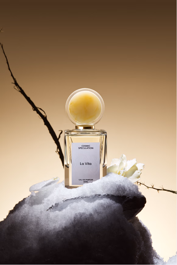 荒漠上是零落的枯木,连仙人掌也了无生机,唯有一朵玫瑰还在绽放,像是在做生死力量永恒对峙的两极。冷杉、肉桂、愈创木、玫瑰精华……萃取诸类香气,在暧昧与直白混合中,香气是我们对凋零日玫瑰的注解。它是荒境里最后一支存活的玫瑰,人类用眼睛发现它,注视,它开始凋零,却在凋零的回声中永存。