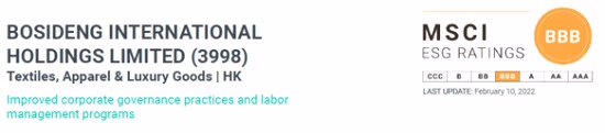 近期,摩根士丹利资本国际公司(英文简称“MSCI”)将波司登的ESG(环境、社会和公司治理)评级从“BB“级上调至“BBB”, 在中国纺织服装业处于领先水平。