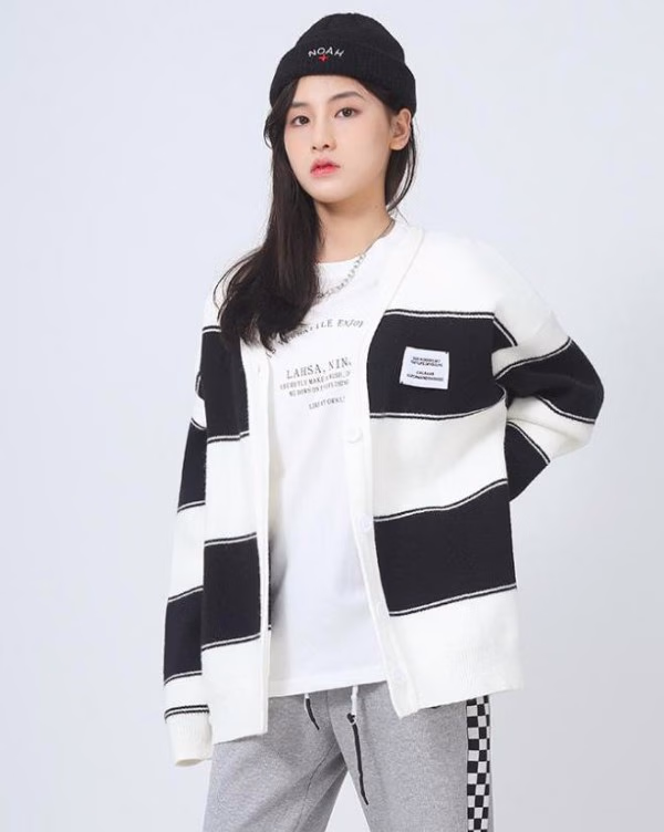 如果不喜欢上面那块披肩毛衣,那么这款完全是为居家生活准备的,毛衣整体上以黑白色贴为主,类似现代风格,采用单排扣,彰显对舒适的追求,v字领口,搭配项链,更是美上加美,这就是品位象征,材质使用上,以人造羊毛为基础,保暖吸汗,那怕是去锻炼,也是完全可行的,又是一款好毛衣,值得入手。