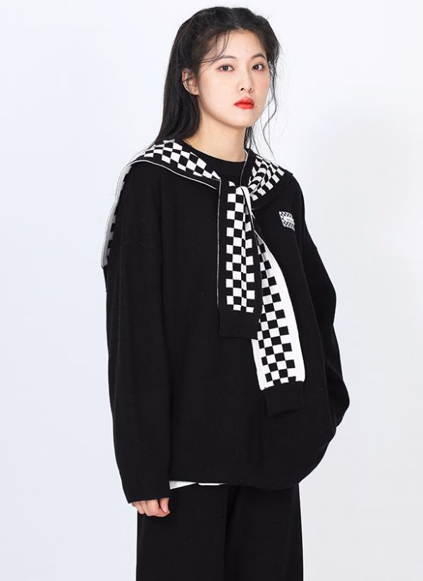 初看就会被黑白双色,简约大方的设计给吸引住了,领口采用圆领,自由舒服,袖口延续当下流行的直筒型,弹性宽松,底部直接无缝剪裁,更显年轻无拘束,最让人欣赏的是,这个小领带创意,以国际象棋盘风格,融合到毛衣上,给人一种学院风格,黑白不在单调,反而变得有趣,惹人探索,材质上以人造棉为主,保暖不起毛,冬季非常值得推荐的一款毛衣。