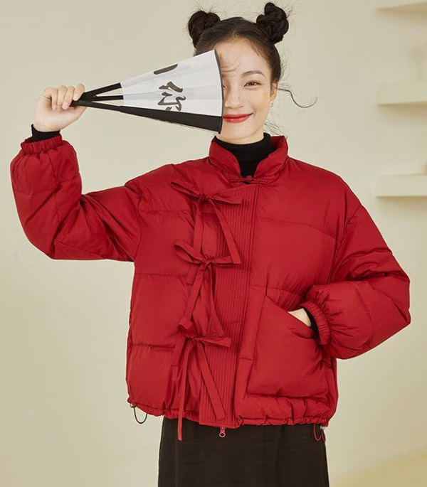 如果上面设计比较欧美、时尚、大气型,那这款带有浓烈的中国红,就不得不拿出来介绍给大家了,最先看到的中国风的小盘扣、蝴蝶结系带、复古灯笼袖的特色。那么领部设计,挡风立领结合小盘扣,装饰颈部线条,带来视觉新鲜感;蝴蝶结系带,衣侧三排系带,随心系成各种形状,打破常规羽绒服的平庸视感;灯笼袖口,仿古代灯笼,袖口有弹力绳,可松紧收口,有效抵御风寒;口袋方面,采用方形大口,有一定的立体感,插手也很方便;最后说到面料,一直使用人造纤维,耐磨耐穿,洗后不起皱,填充还是白鸭绒,轻巧又保暖;综合上面这么多优点,这款中国风羽绒服,值得一试。