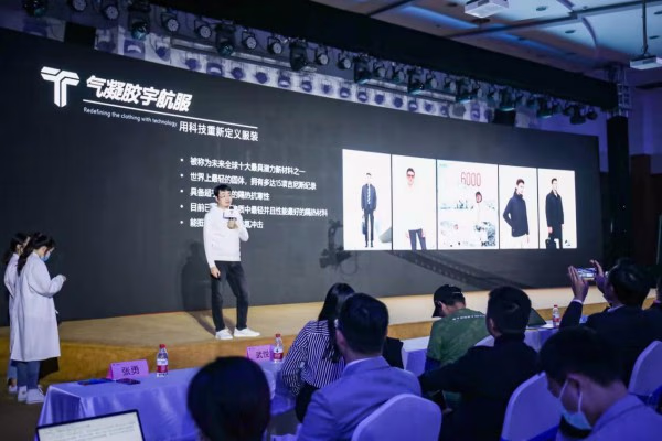 例如,用世界十大新材料之首的气凝胶打造的中国老百姓第一件“宇航服”;防污防油防水的T恤;用金属相变材料制作的吸能储能放能的高科技鞋垫,让你在寒冷的冬季走路五分钟温暖一整天;用3D打印技术把羽绒压缩融合进针织面料的长袖T。