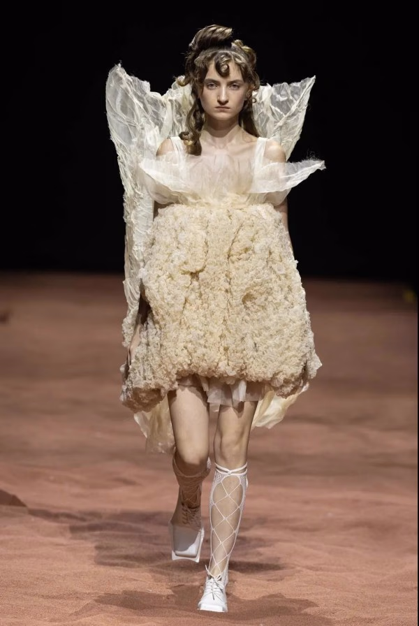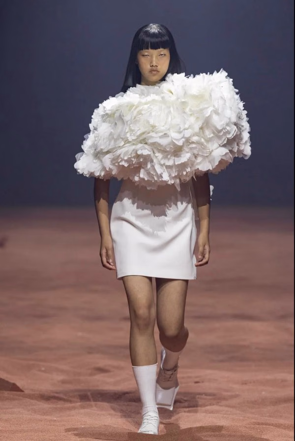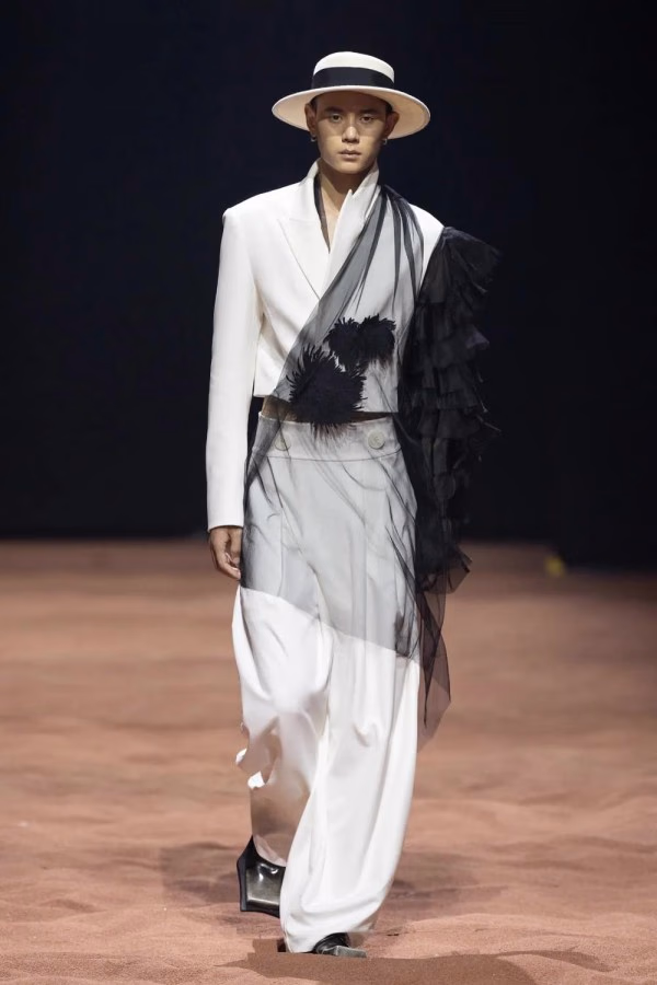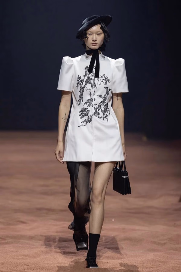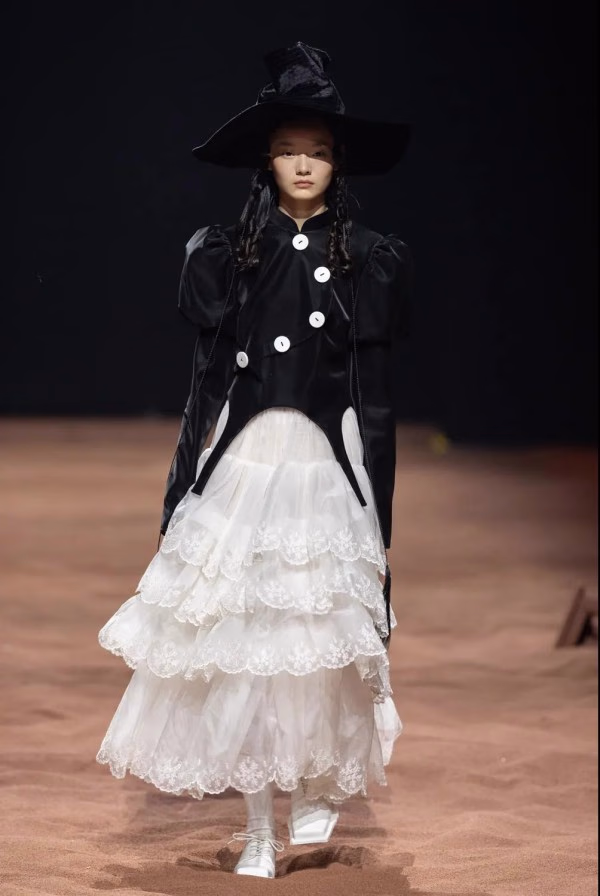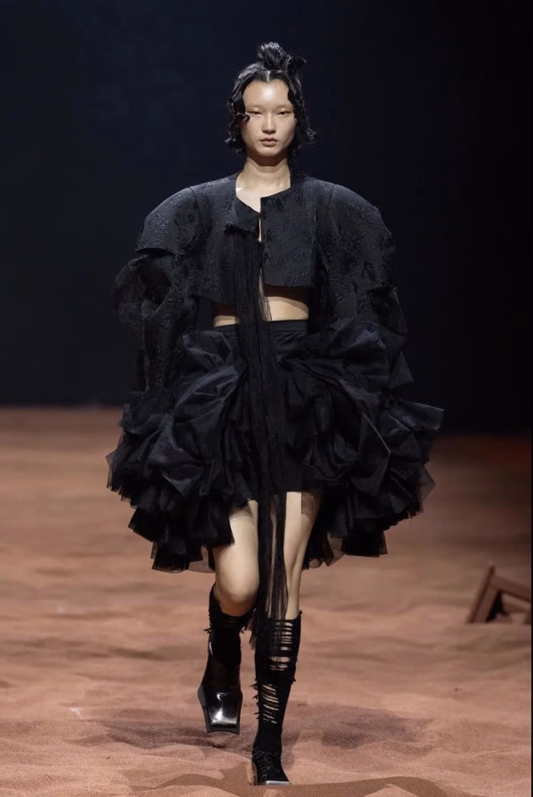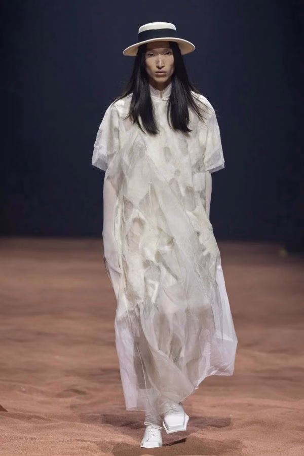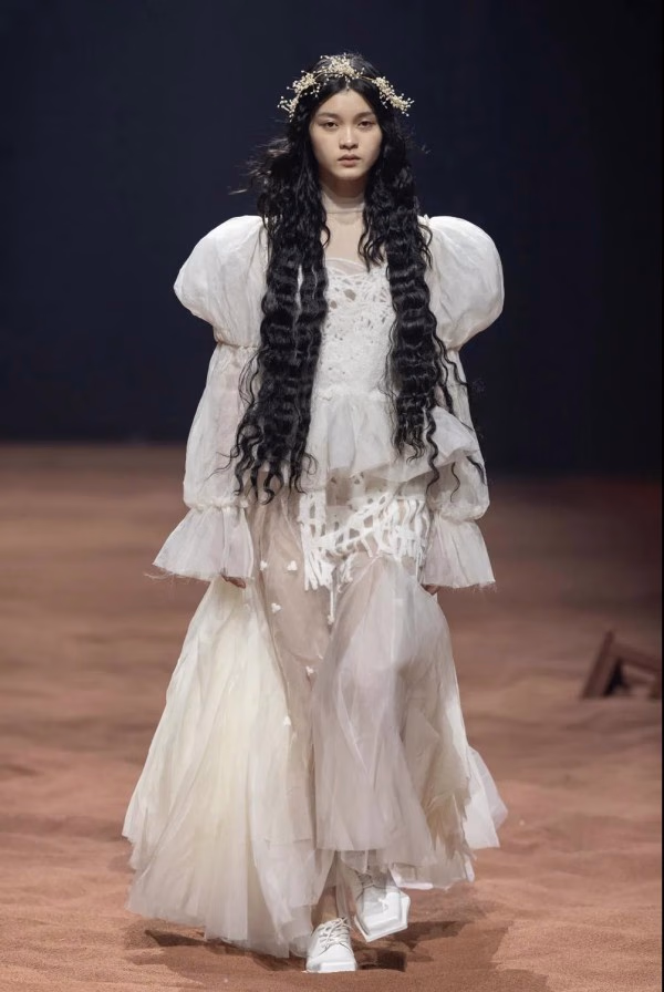BANXIAOXUE本季设计灵感是关于对永恒概念的思考,但愿人长久的命题是真是假?什么是长久,长久是否存在,在这种美好愿望的背后是人们怎样的心理?我们应该如何面对失去,面对离别,面对死亡,并从中找到属于自己的归宿和生命原本的意义。秀场由艺术家王子月用剧场的概念来设计,采用荒原的表现形式,将红色泥土与几何装置相融合,引入一个虚幻的空间。系列并无固定的外在形象,是一种不断变化的状态,内心对美有自己的定义,并无止境的追寻。骨骼刺绣打底衣是本季发布非常重要的一个单品。