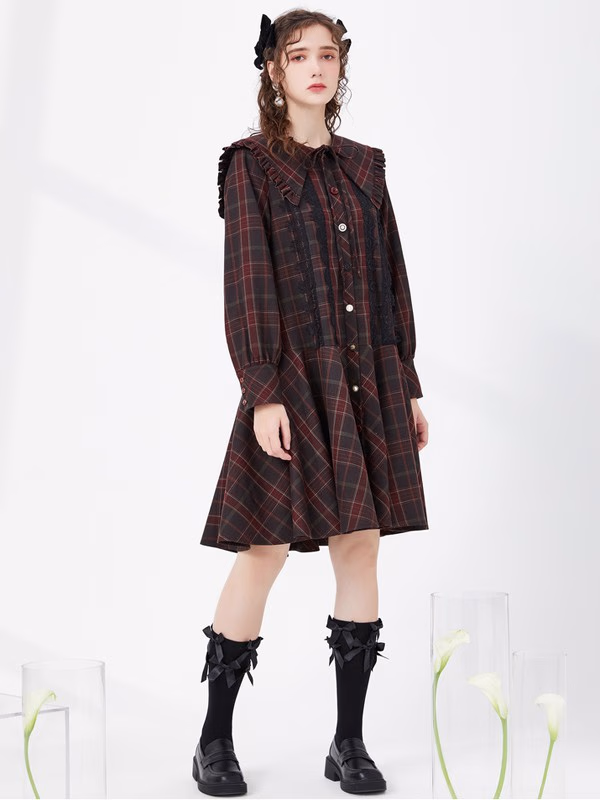 暗色系的格子连衣裙给人的感觉就是非常显瘦的,很多妹纸们可能会想色彩那么暗会不会不好看?其实相对来说暗色系的服装都比较显瘦,但是款式选择的得当还是非常气质的,小编推荐的这款连衣裙就是不错的选择,娃娃领的款式加上百褶的裙摆设计能够很好的修饰身材,搭配上马丁靴会更加帅气哦!