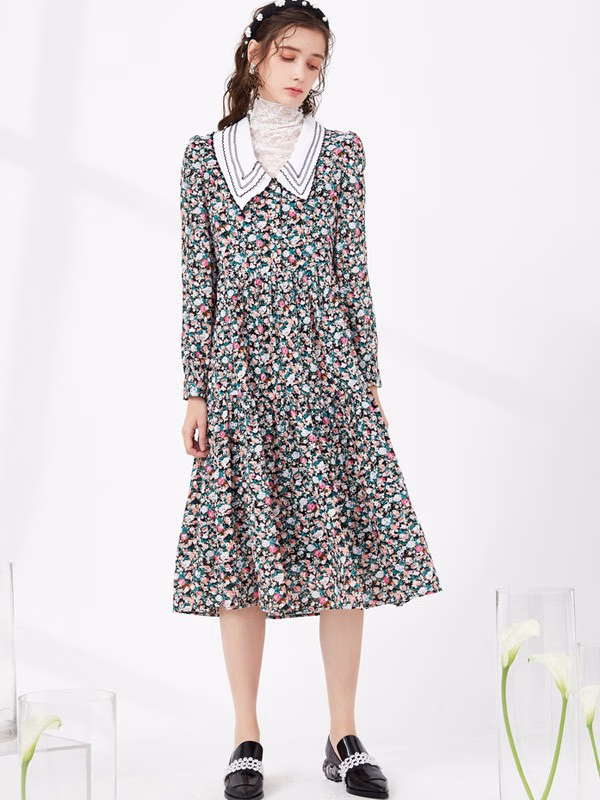 这种V领款式的碎花连衣裙有非常多的穿搭方法,可以选择蕾丝网纱的叠穿,也可以选择单穿,对于腿型不是很自信的话这款长款的碎花连衣裙非常值得选择,流畅的收腰设计加上褶皱的裙摆能够很好的修饰腿部线条,显瘦的效果一级棒!