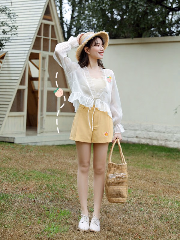 轻薄的白色开衫,带着隐隐约约的美,开衫的边缘,都是花边形状,细节中都是满满的少女感。内衬搭配一件白色背心,下身同样是搭配一件黄色的短裤,显白又温柔。