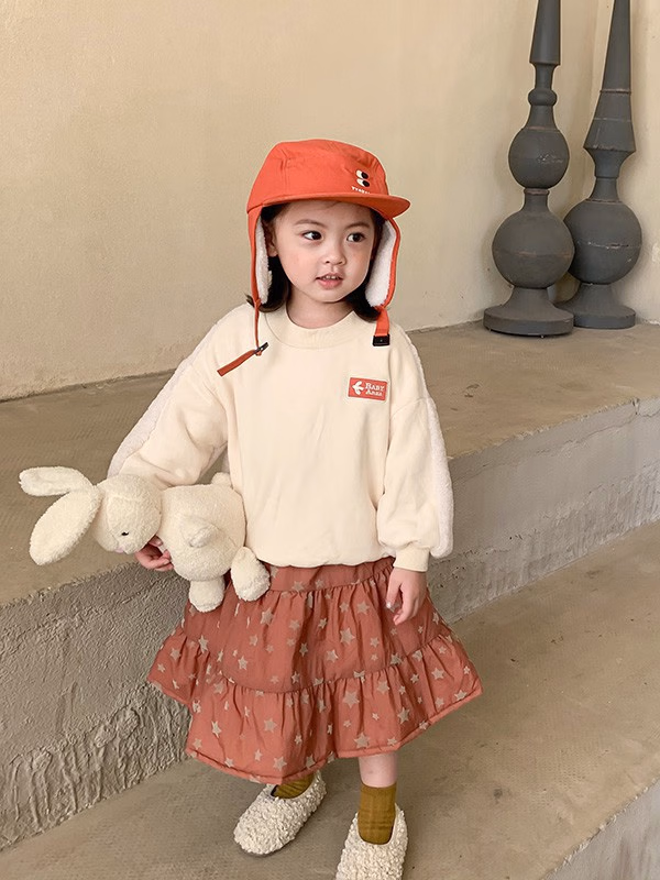 其实孩子的穿搭和大人差不多,越简单越好只不过在色彩方面可以略微鲜艳一些,这款米色上衣+星星印花半身裙十分俏皮可爱,搭配和裙子同色的帽子更加俏皮可人,一双毛毛棉鞋作为搭配可爱又保暖!