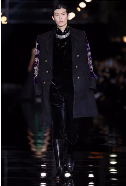 黑、金、蓝、紫、绿等颜色,是大秀服装的主色,均来源于苗族传统服饰配色,勾勒出了苗族文化的斑斓色彩,除了这些民族历史的浓厚底蕴,大秀服装上也出现了多种年轻时髦的装饰:例如铆钉、串珠、链条等,采用法式钉珠、编织、链条绣、珠绣等工艺,将每件服装赋予第一无二的特性,正如年轻一代追求个性与自我的处世态度,这些画龙点睛的装饰品让年轻人的时尚在大秀舞台上更加吸睛夺目。