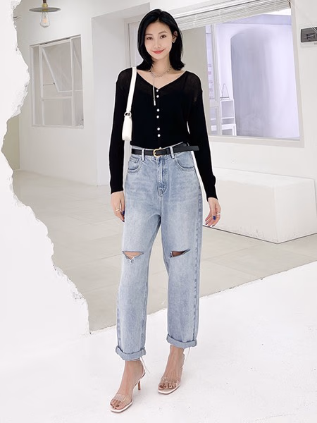 进入秋天后,衣橱里就得备上几件基础的针织衫了,一件黑色的针织衫,优雅又大方,不挑人,谁穿谁好看,V字领的领口,可以很大程度的展示出你的优美的肩颈线条,再配上一条项链,就更美啦!下身搭配一件牛仔裤,高腰的版型,阔腿的裤脚,修饰身材,瞬间调整你的身材比例。破洞的小设计,随性又自然。