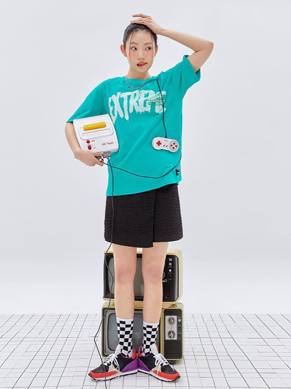 宽大的T恤,是甜酷风的重点之一,宽松的版型,不修身,让整体更加的休闲,才能打造出那股随意感!选择一件青绿色的颜色,穿起来元气满满,显得很有活力!简单又带点个性的印花,让T恤多了一分酷酷的感觉。下身搭配一件简单的小短裙,很俏皮。一双运动鞋搭配一双个性的棋盘袜子,能够让你看起来更加的时尚。