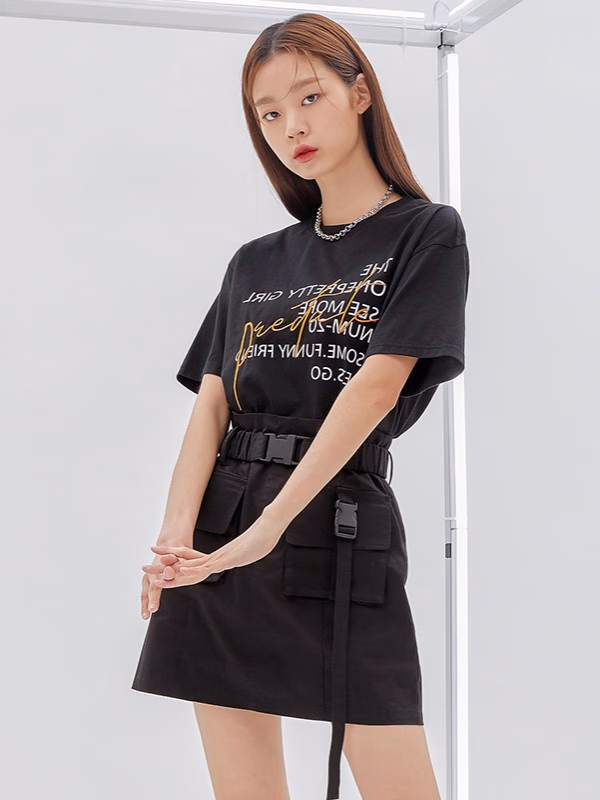同样是选择一件黑色的T恤,下身选择工装的短裙来搭配,增加造型感,很中性!这一身比较的简单,一定要搭配上一些项链装饰。