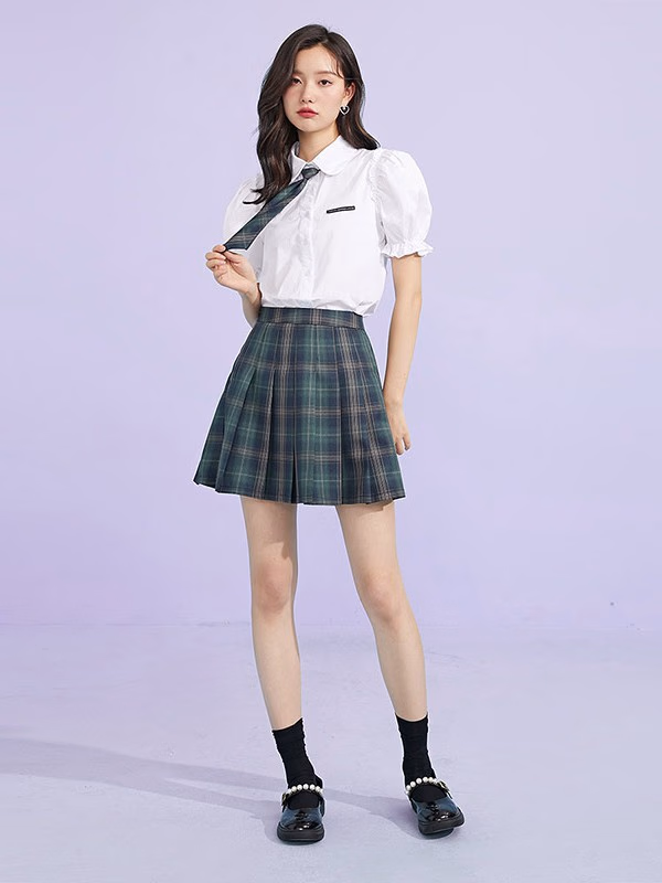 这两件单品拆开看都是属于比较清新简约款式,上身这件白色衬衫,整体的版型都是很可爱,略微紧身的设计,显得上身比较的小巧,袖山处蓬起呈泡泡状的袖型泡,风格上更贴近浪漫主义,穿起来比较的女性化,同时上半身的肩膀更有型。系上一条与裙子相配的领带作装饰,与下身的格子裙上下呼应,更加的时髦。绿色方格的小短裙,复古显白也很有少女感,上身效果就很温柔。