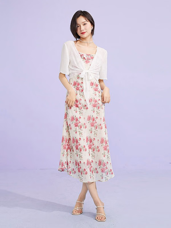 唯美清新的碎花长裙,甜美又带点女人味,粉红的花朵图案均匀布满裙身,很甜美的一身长裙。高级的剪裁,整裙子版型都在突显出优雅的气质。吊带的长裙,露出美丽的肩颈线条,在外搭配一件白色罩衫,不会那么单调。