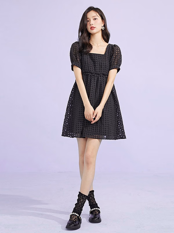 纯黑的小黑裙,上身十分的显瘦。镂空的设计,很有特点,活力又元气!A字裙的裙摆,也很减龄。