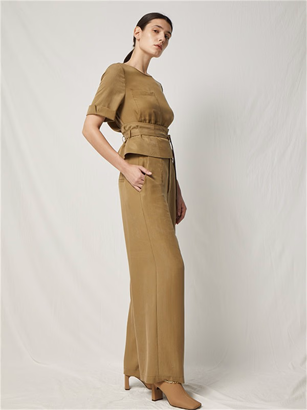 饱和度低的橄榄绿,是时尚界最爱的颜色之一了。整体的剪裁,优雅大方,很显质感。腰间绑带帮你突显腰线很显身材,下身阔腿的长裤,走起路来气场十足!