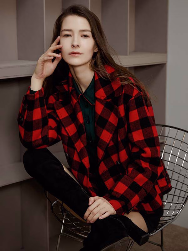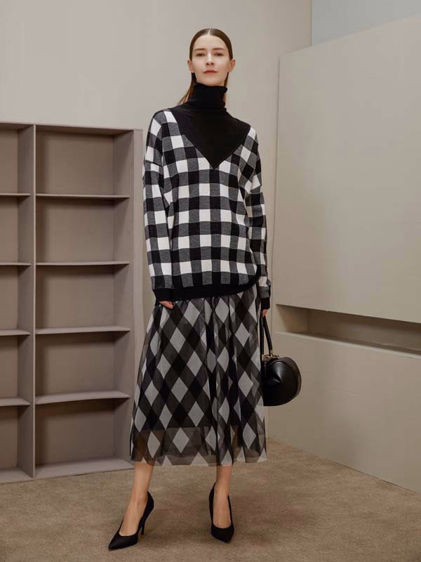 都说格子装不能一起搭配,但是如果真的想要一起搭配的话就尽量选择颜色差不多,不然会显得过分的突兀,小编推荐的这款格子搭配就非常和谐,菱形的搭配带有垂直的设计能够修饰腿型和拉长腿型,如果颈部不长的话这款上衣不太建议了哦!会显得脖子较短~~一双黑色的尖头高跟鞋会更加有气质哦!