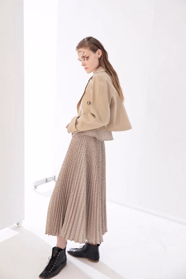 系列采用日本进口涤纶长丝纱线织造底布,在国内增加后工艺处理。经进口染料数码印花波点元素应用,清新文艺。此面料经纬向都采用长丝粘纤,结合高密度织造。面料质感软糯亲肤、垂感好、透气性佳,数码印花后面料更有风格。