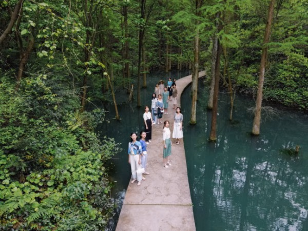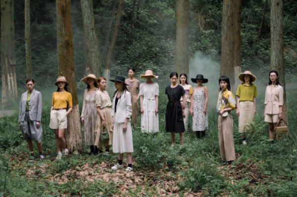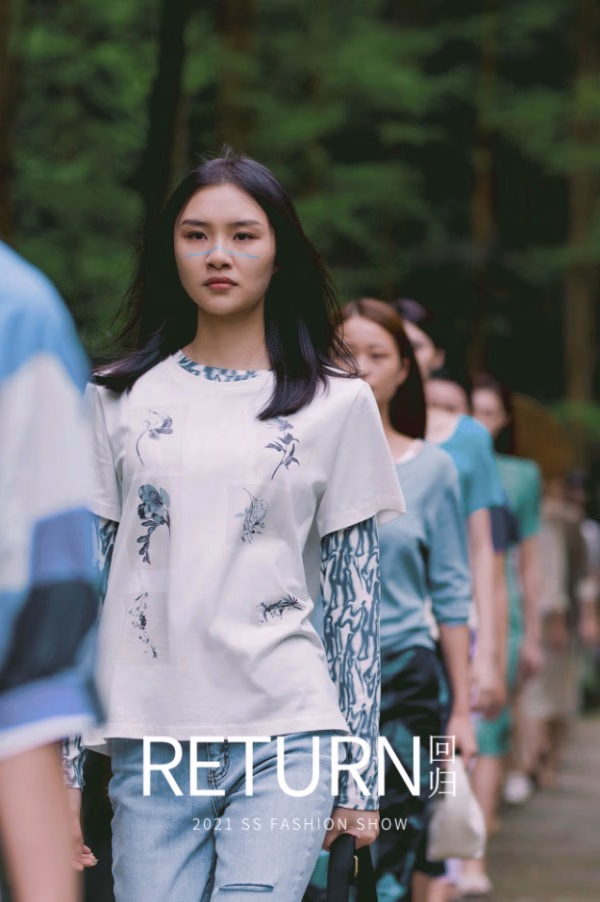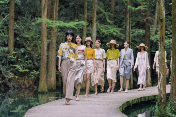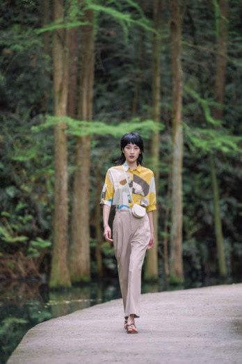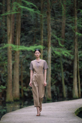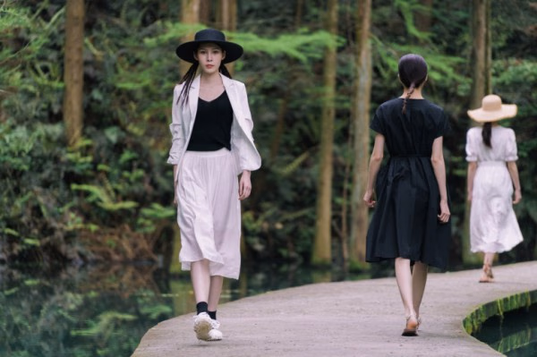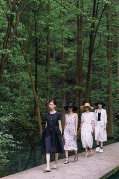 indicia 2021夏季秀场走进静谧丛野,被一汪绿池环绕的青石板路形成天然T台,为走秀增添了自由的氛围感,模特、衣物与自然融为一体,在野外的原始环境中起伏浮动。