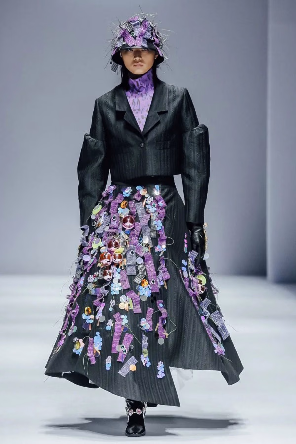 CHENG CHENG的服装不仅体现在视觉创意上,设计师还将听觉上的声音转化成视觉上对声音的感知,将亮闪闪的铃铛与亮片制作成“怪兽皮肤”,结合手工刺绣,在服装上形成独有的“声音面料”,呈现出极具实验性与戏剧张力的视听盛宴。