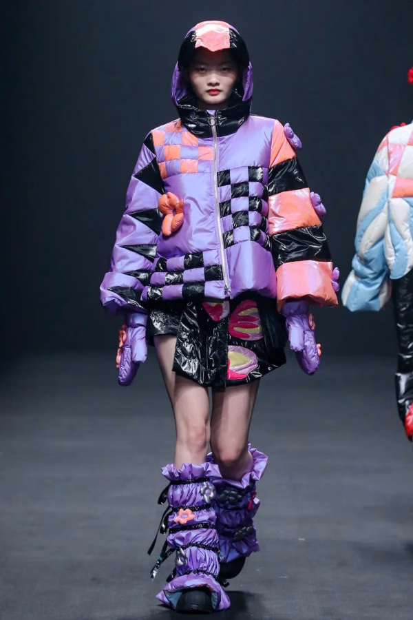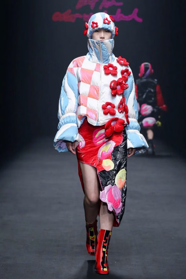 本季主要采用面料拼接技术、印花撞色、肌理再造等工艺,浪漫而有流动感。设计师夏乙旗尝试通过复杂编织布料呈现出“动”态的浪漫与反抗的力量,绚烂的色彩包裹在充满空气感的立体印花上,企图打破冬装的固定规则,强调服装层次感之余,更凸显自由与束缚、浪漫与规则的冲突感。