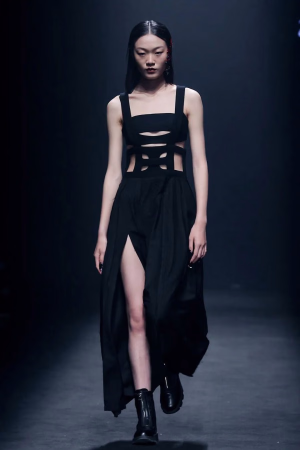 除了在用材上的讲究之外,在造型上,外露的呈现方式也是JENNA HUANG对概念"COMPROMISE 1/2"表达的另一维度与手法。设计师从大衣搭配手撕丝袜入手,大胆又隐晦的造型解放衣服的性别倾向。她尝试将利落的几何结构与自由叛逆的精神调和,平衡设计与社会的关系,并探索身体与服装之间更多未知的可能性。
