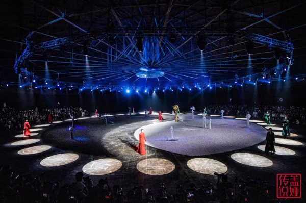 秀场以太极的舞台和八排座位设置构成了乾坤阴阳八卦图,太极阴阳的空间中,矗立12兽首;而场地穹顶设计为日晷,将时间和空间相对应。