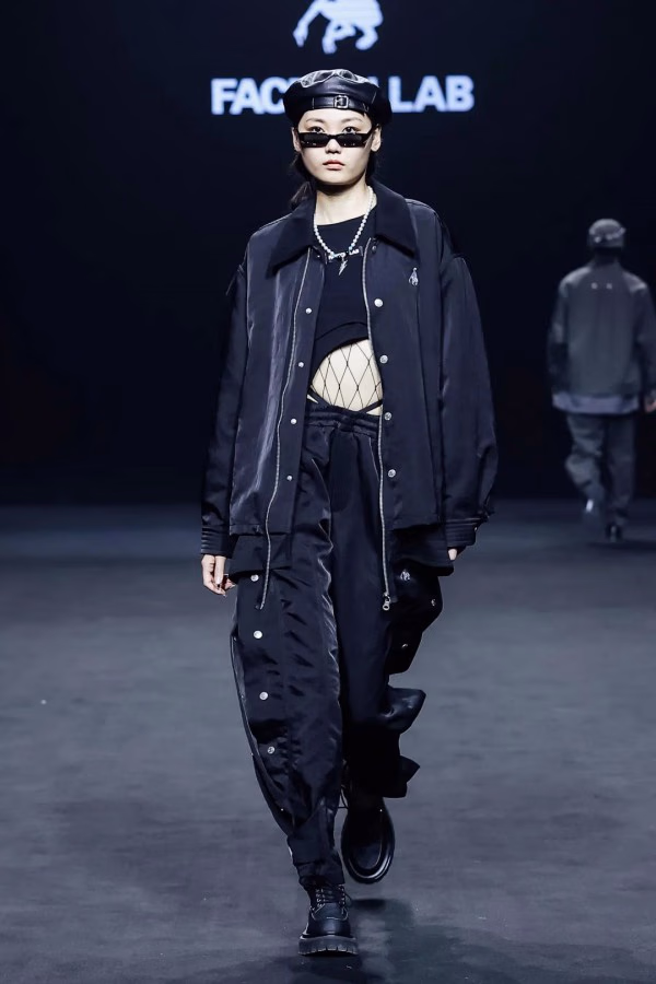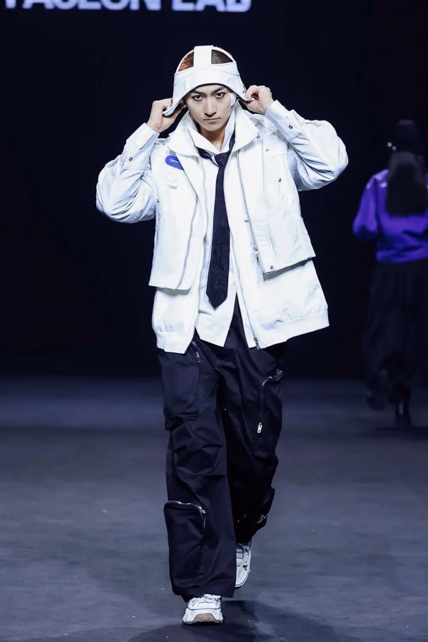 整个系列运用科技感的面料与传统面料的结合碰撞,裁剪也大量运用了解构主义的经典拆解重组。个性化的表达,潮流化的设计,结合现场氛围,热血沸腾,唤起了每一颗向往年轻的心。
