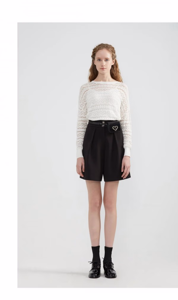 镂空针织在轻盈透气之余,更加入了少女式的小性感,用帅气的收腰百慕大中裤达到“ 娘man平衡”,可甜可酷的气质这样一套就能简单get!