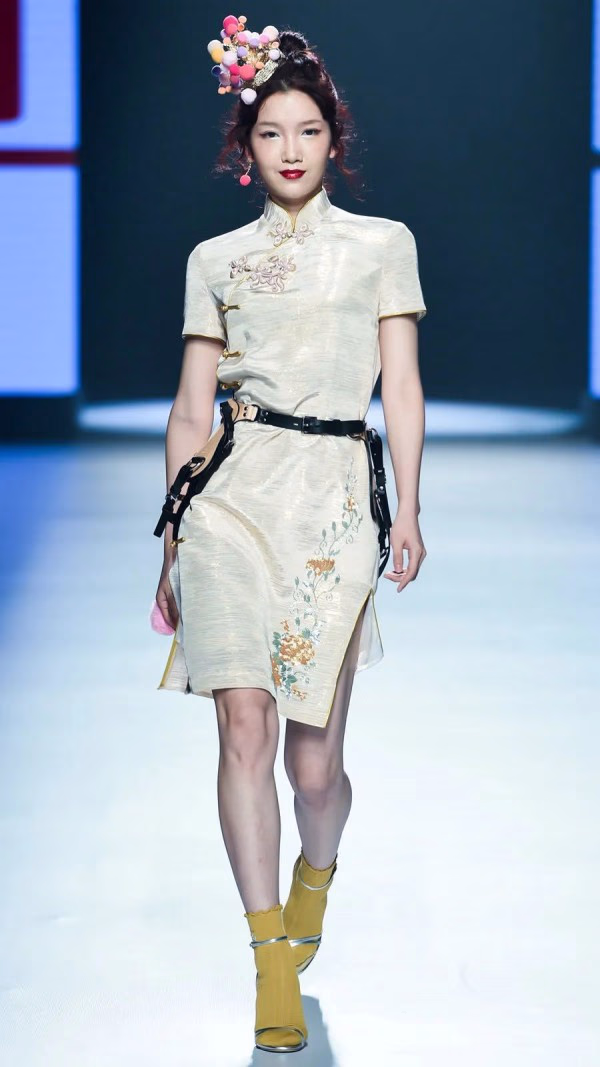 乍一开场,即被惊艳,开场出乎意料地使用了富有节奏感的音乐,模特身穿的修身旗袍,在保留传统版型之余,龙凤花鸟的钉金绣也作为点睛之笔缀于白、蓝、黑、金衣身之上,配饰上运用了大量活泼俏皮的毛绒头饰、塑料眼镜、耳机,搭配将身材一分为二的皮带束腰以及精致小巧的皮质手提包完全颠覆了传统中式旗袍的形象。