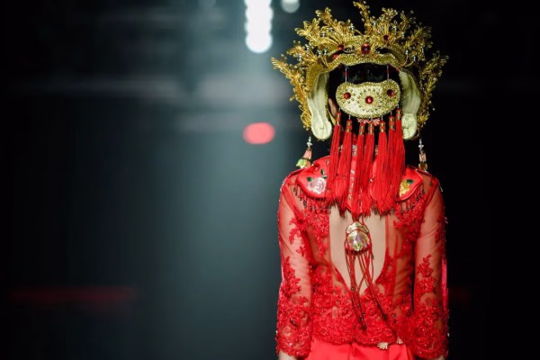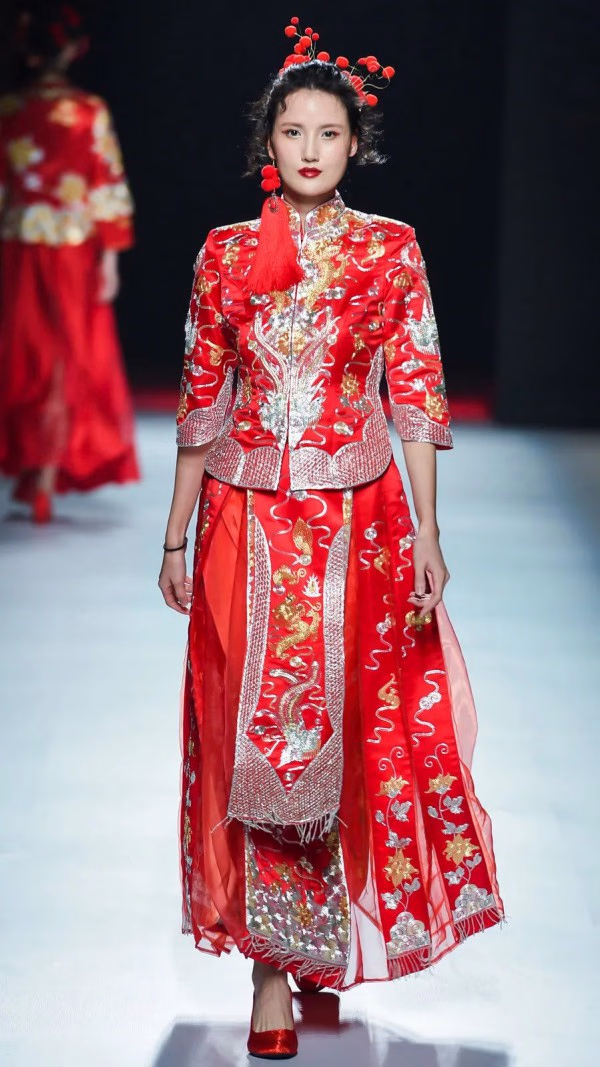 小茹裙褂嫁衣设计不拘于形,在贯彻寄托对婚姻美好愿景的大红色和金银珠饰之外,借鉴了西式婚纱样式的镂空、薄纱、抹胸裙等元素,兼具东方吉服的喜庆与庄重和西式婚纱的优雅与性感。