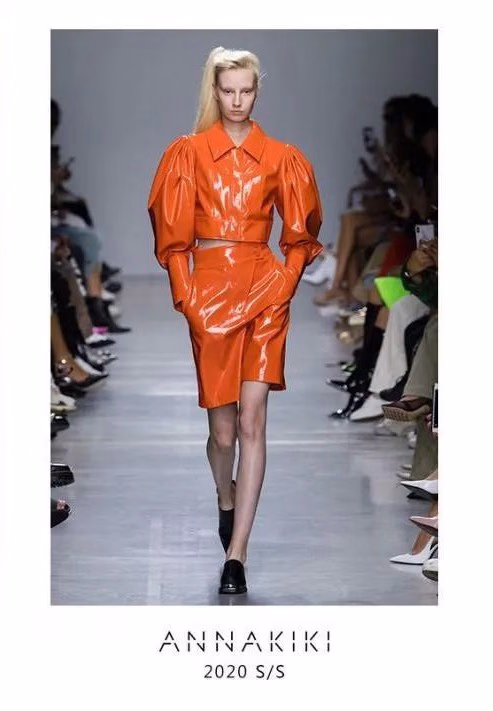 丁当二公身穿的桔色亮面夹克同样来自ANNAKIKI 2020S/S 米兰时装周走秀款。大胆的用色和面料让这件外套燃到炸裂。