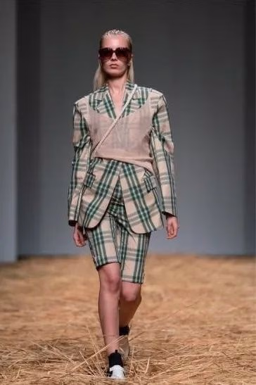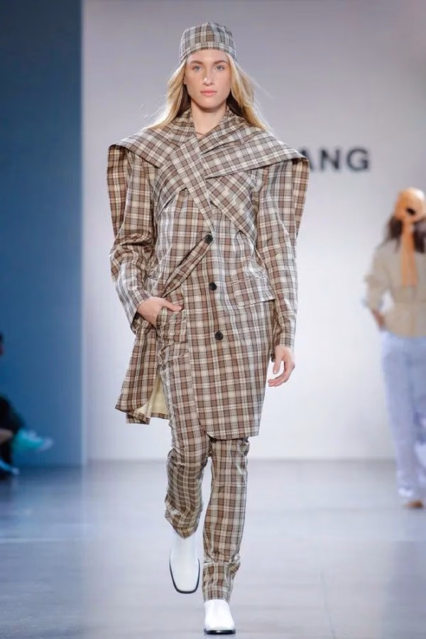 郁可唯身穿DAMOWANG 20SS上海时装周秀场系列录制《乘风破浪的姐姐》复古的绿色格纹西装加上薄缠丝背心点缀,有趣而独特。