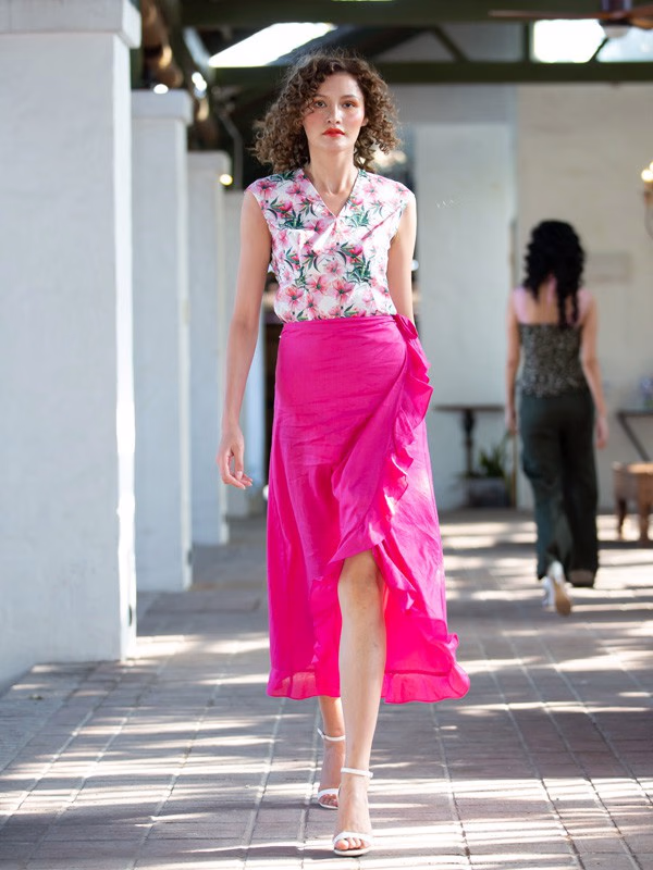 例如这款旗袍,荧光绿已经非常点睛,再出现玫红色就喧宾夺主了,这样的撞色不仅不会体现出时尚的感觉,反而容易穿出大妈感。旗袍上的花纹过于繁杂,让人抓不住重点,相较于这件旗袍,白色上衣搭配玫红色半身裙就更加舒适时尚,半裙的设计也更加有气质感,颜色搭配互相照应,更加和谐。