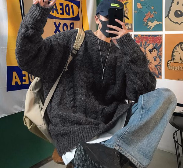 非常经典而且耐穿的这件灰色的套头毛衣,采用粗质感的毛细面料,加上经典的麻花纹理,极大提升了这件毛衣的视觉感,加上宽松的版型,穿着起来非常具有街头潮流感,搭配上白色的长款T恤打底,配上浅蓝色的牛仔阔腿裤,黑色的运动鞋,瞬间穿出高大上的感觉。