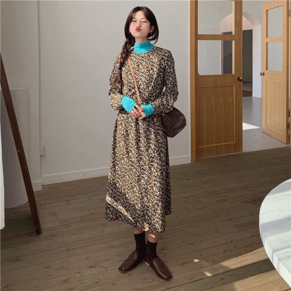 这件颜色比较暗的碎花连衣裙,采用黑色、黄色以及棕色的碎花图案点缀,极大提升了这件碎花裙的复古腔调感,加上高腰修身的剪裁设计,长款的裙摆们穿着起来也非常的优雅迷人。搭配上一件湖蓝色调调的高领打底衫撞色,增强了整体的视觉感,穿出满满韩系感。