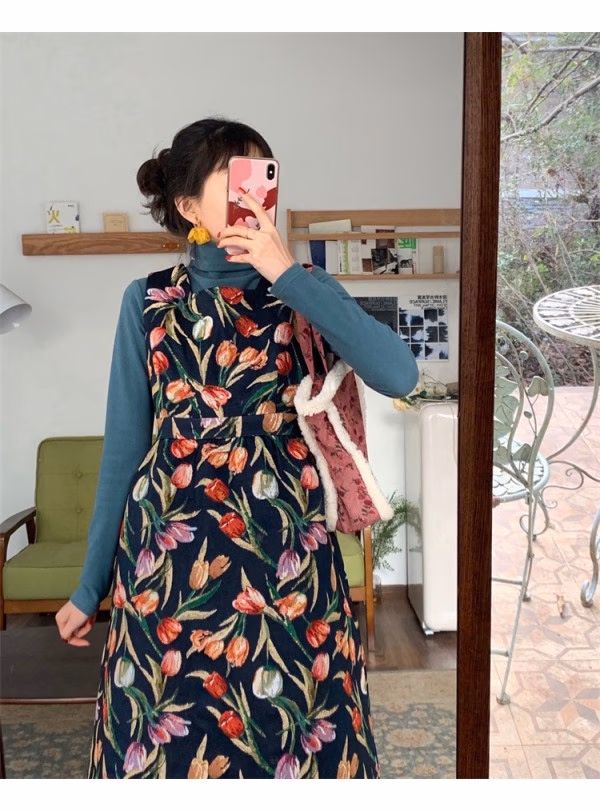 非常有视觉感的这件碎花毛呢连衣裙,采用无袖背心版型的设计,加上优质的毛呢面料,穿着起来非常的保暖舒适。并且油画质感的郁金香印花点缀,更是提升了整体的味道。配上一件雾霾蓝色的高领打底衫撞色,高级又显气质。