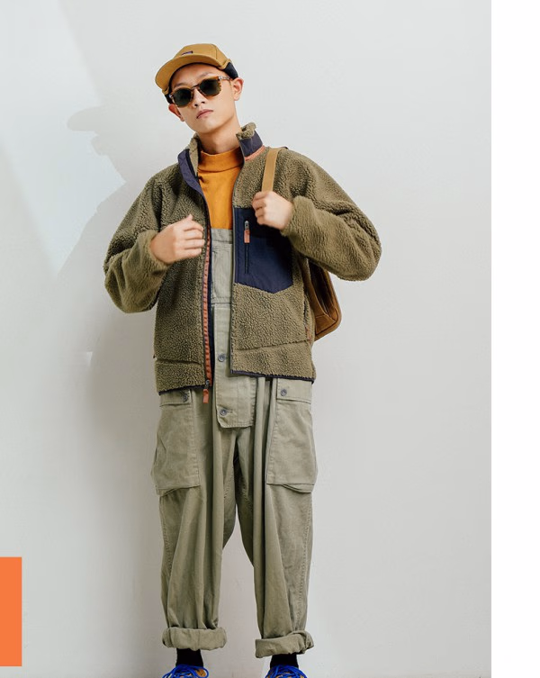 非常具有日系休闲风外套的这件男士摇粒绒外套,采用帅气的军绿色,加上藏蓝色以及橘色的撞色,极大提升了这件外套的时尚视觉感。拉链式的门襟,高领的设计,保暖性极强。搭配上橘色的高领打底衫+日系工装风的军绿色背带裤,一双潮流的运动鞋,即使将拉链拉的严严实实,造型感保暖感都很足。