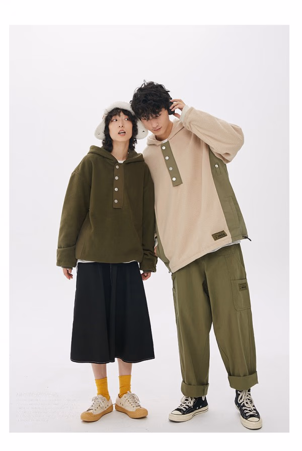 这件男女都可以穿的这款摇粒绒套头外套,采用连帽卫衣风的版型设计,加上POLO衫的门襟,带着满满日系风的气息,加上复古感的色调以及拼接,穿着起来包容性很强,也十分的温暖,女孩可以配上日系工装半身裙,男生可以搭配上军绿色的工装裤,帆布鞋,简单又舒服的日常穿搭。