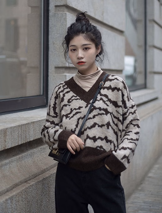 V领款的套头毛衣对于身处比较微胖的女孩们来说,绝对是不能错过的一款单品,因为它穿起来非常的显瘦好看。这件豹纹纹理感的V领套头毛衣,采用短款的版型设计,加上灰色与咖啡色的碰撞,带来满满的时尚气息。内搭一件奶茶色的高领打底衫叠穿,非常有层次感,下穿黑色的牛仔裤,一双黑色的小短靴,非常的轻熟耐看。