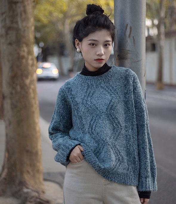 非常温柔的这件蓝色的套头毛衣,采用粗质感的毛衣面料,融入加上菱形的勾画设计,让这件毛衣看起来非常的优雅耐看。而且小圆领的设计,也能够很好的修饰脸型。宽松的直筒袖子,能够带来轮廓感,也能够很好的修饰手臂上的肉肉,搭配上黑色的高领打底衫,下搭奶杏色牛仔裤, 日系文艺少女本人,没错了哦!