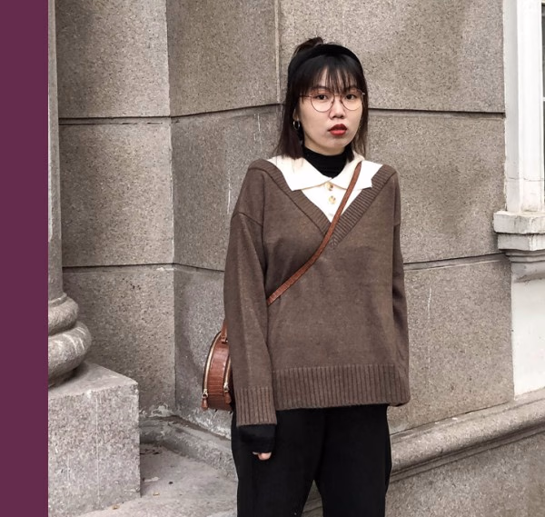 这件假两件式的套头针织衫,采用白色的POLO衫衣领与V领的焦糖色衣身的拼接设计,极大提升了这件这件针织衫的时尚感,穿着起来非常具有视觉层次感同时也具有非常强的减龄显瘦的效果。在深冬时节还可以内搭一件黑色的高领打底衫,外穿一件浅色的大衣,时尚感非常的强。