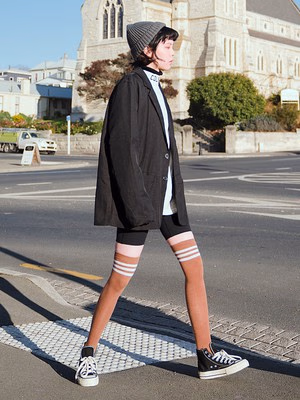 比较长的袜子可以选择比较轻薄的款式,这样在脚踝和小腿的部分进行堆叠才更加好看,如果袜子比较厚的话堆叠之后会显得比较臃肿,不能够更好的体现腿细的效果。