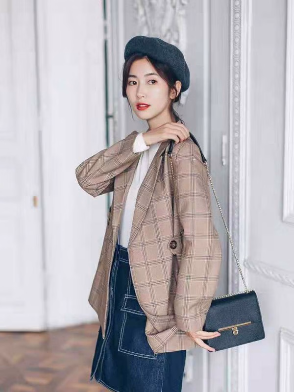 西装穿搭正流行,女生可以为自己挑选一款棕色的格纹西装外套,颜色柔和耐看,符合秋日的氛围,格纹元素时尚经典,穿起来利落大方,里面可以搭配一件白衬衣,颜色清爽干净,提升造型的气质感,组合搭配有层次感。下身搭配一条牛仔半身裙,牛仔元素率性时尚,穿起来拉长女生身型,时尚简约。出门佩戴一顶贝雷帽,提升造型的时髦度,呈现出了时尚的文艺造型!