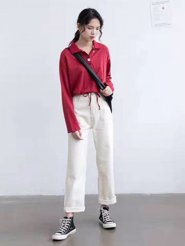 要呈现出亮眼的穿搭效果,单品的选择也是很关键的。女生可以为自己选择一件红色抽绳POLO领卫衣,颜色显白,视觉冲击力强,给人留下深刻的印象,短款的设计拉长身型,穿起来休闲时尚。下身搭配一条白色的休闲裤,颜色清爽干净,穿起来简约率性,穿搭的时候卷起裤脚更具时尚感。搭配一双黑色的高帮休闲鞋,呈现出了时尚亮眼的初秋造型!