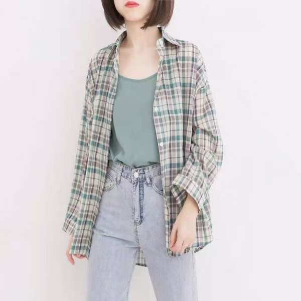 衬衣在初秋也是运用频率很高的单品,女生可以为自己挑选一款格子衬衣,配色清新自然,格子元素时尚经典,穿起来休闲时尚,里面可以搭配一件豆绿色的吊带背心,颜色清新自然,穿起来简约大方。下身搭配一条浅色系的高腰牛仔裤,色调清爽干净,高腰设计拉长女生身型,穿起来率性时尚,呈现出清新时尚的初秋造型!